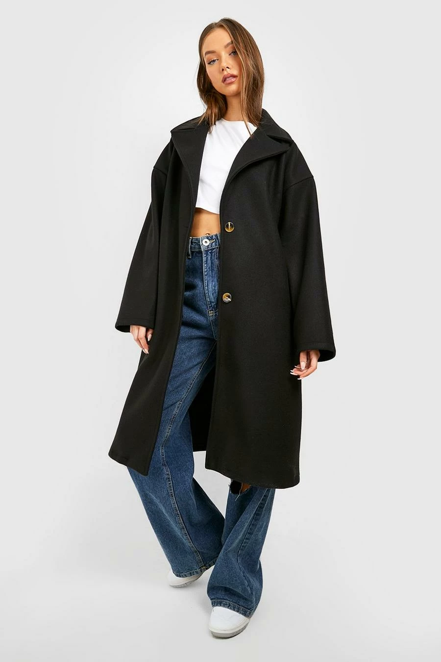 Get cozy this season in this wool coat, sporting a button-up front and shallow pockets; this piece is perfect for layering in colder months. The oversized collars and wide neck opening of this wool look coat are flattering on all bust sizes and can be worn for any occasion. Add sweatpants and a tank top for quickly running errands on cold days or mom jeans and a racerback bodysuit when you’re heading out for food with friends. This women’s wool coat will always have your back.