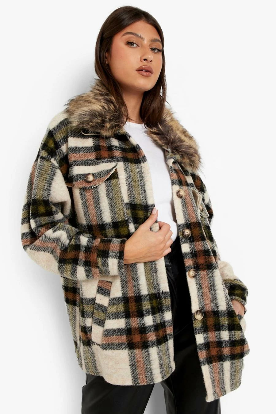 Main :55% Polyester 32% Wool 13% Acrylic Lining: 100% Polyester Collar: 65% Acrylic 35% Modacrylic . Do not wash. Model wears size 10 .