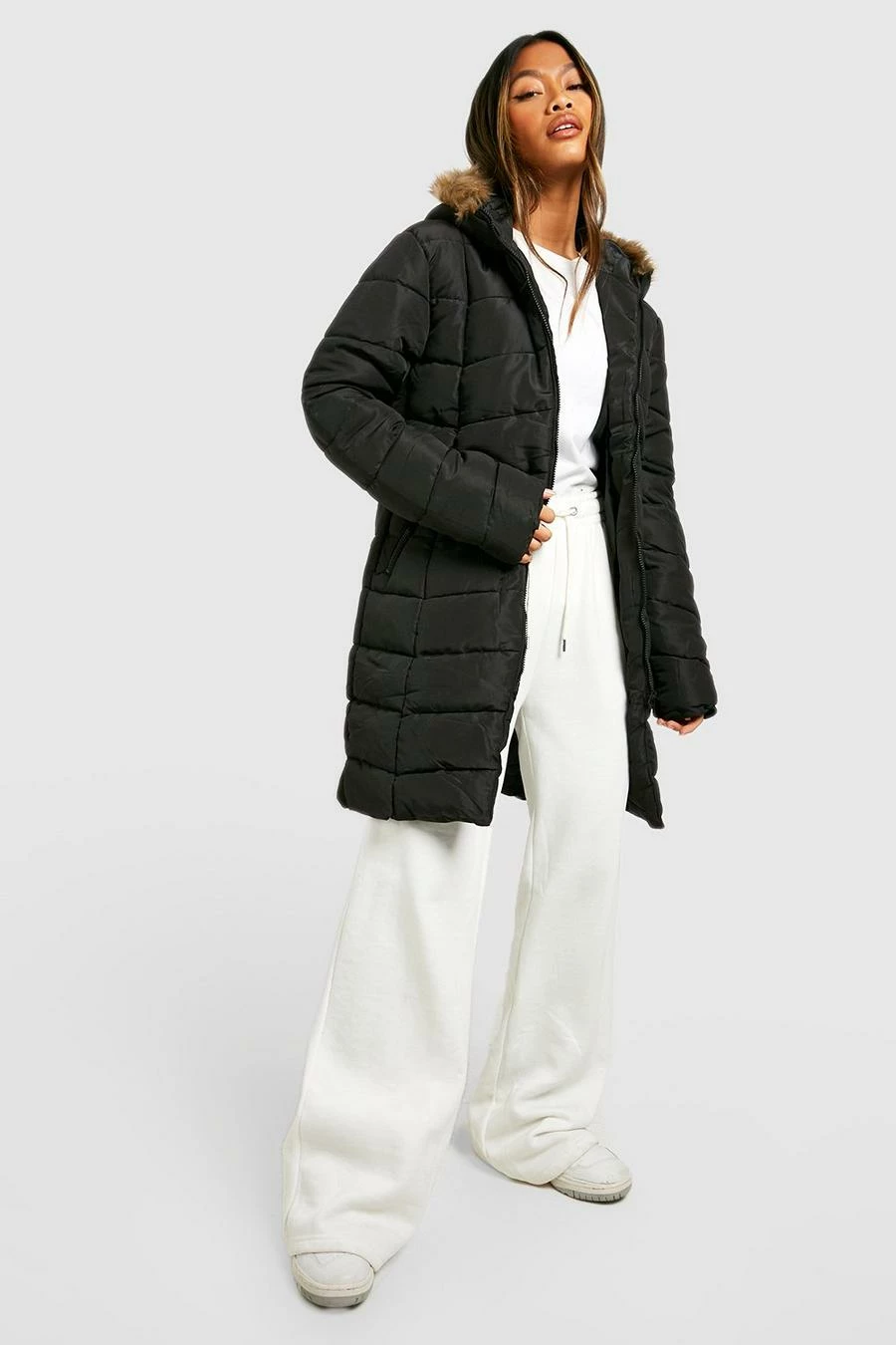 Shell: 100% Polyester. Lining: 100% Polyester. Filler: 100% Polyester. Faux Fur: 100% Acrylic. Machine Wash. Model wears US 6.